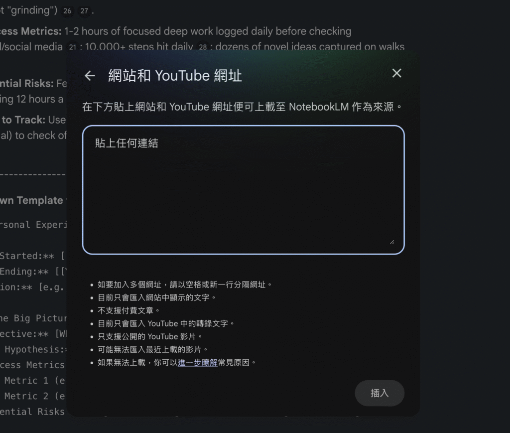 NotebookLM 原生就支援批量上傳 URL。你只要把 CSV 裡面的所有網址貼進去,幾秒鐘就能整批匯入。