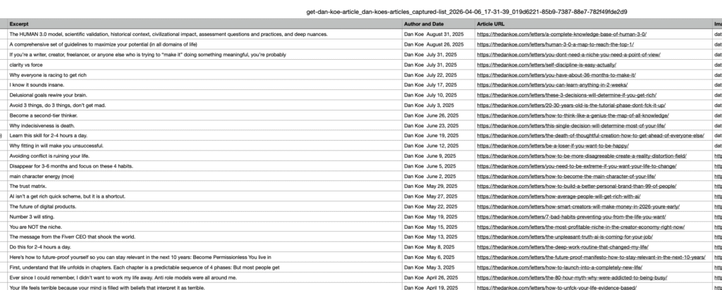 到了 2026,它還是最好用的無程式爬蟲工具之一。它可以把 Dan 整個文章 archive 整理成一份乾淨的 CSV,裡面包含標題、短摘要和網址。其實你用什麼爬蟲都可以,重點不是工具本身,重點是你要快速拿到乾淨的 URL。