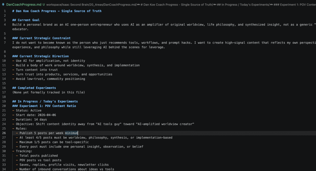 我現在真的有一位屬於自己的「Dan Koe 實踐教練」住在我的 Obsidian vault 裡,而且它每天都會跟我對話。我的內容產出多了,但同時又 100% 保持我原本的世界觀。( 少即是多。其實就算只有 93 篇文章,也已經完全夠用了。)
