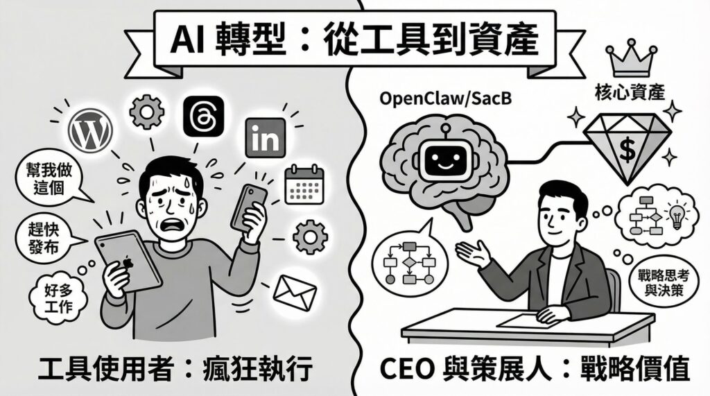 AI 時代,內容生成成本趨近於零。如果你還在用 AI 做「印表機」,你只是在製造數位垃圾。本文分享我如何利用 OpenClaw (Clawbot) 重塑一人創業的護城河,從「工具人」轉型為「價值創造者」。