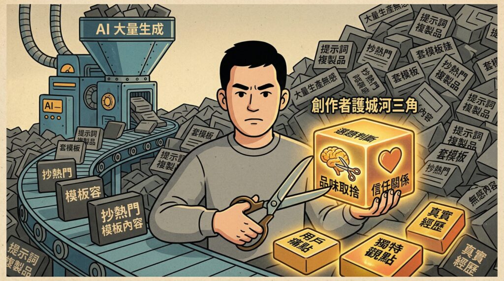AI 時代,內容生成成本趨近於零。如果你還在用 AI 做「印表機」,你只是在製造數位垃圾。本文分享如何透過「創造垃圾」快速累積現場經驗,建立精準 Prompting 能力,成為一人創業的藍領贏家。黃仁勳、Alex Hormozi 真實案例+3步行動指南。